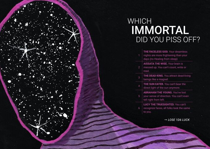BROKEN LUCK is a full-color zine supplement for the science-fantasy tabletop RPG TROIKA! Be a Kid God. A Holy Beast. A minor deity or a powerful mortal being. Whoever you are, you’re an unlucky traveller and you’ve crossed the childish Gods. Now your life is a mess. You wander across the spheres and hide from the vengeful immortals. You seek their secret palace to take revenge and free yourself from their wretched curses.