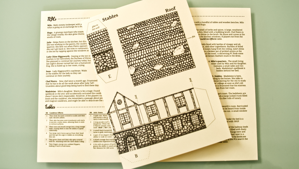 Somewhere in the countryside stands The Perpetual Broth. The inn prides itself on its namesake, a soup that has been cooking for almost twenty years. The soup is constantly topped up with new ingredients, giving it its signature taste. But yesterday evening Julie, the kitchen help, disappeared, and this morning a guest woke up with his skin rose-scented and covered in thorns. Milo the innkeeper asks the adventurers to find out what is going on.